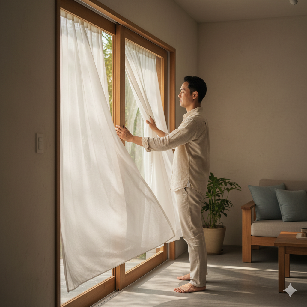 Angka panduan: ACH (Air Changes per Hour) alami harian 4–6 ACH di ruang keluarga; kamar tidur 2–4 ACH malam hari (lebih tenang).